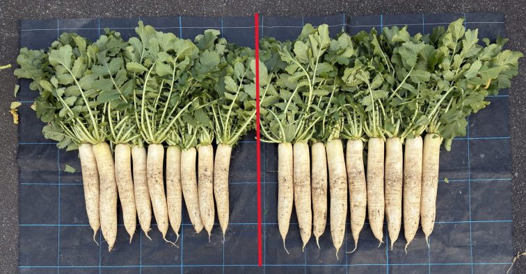 藻合力の効果でのもう1つの特徴が、「葉面散布でも根にしっかり効く」点です。葉面散布でも根の数・太さ・長さが向上し、ダイコンなど根菜類でも効果が確認されています。根張りが強化されることで養水分の吸収力が向上し安定した生育につながります。